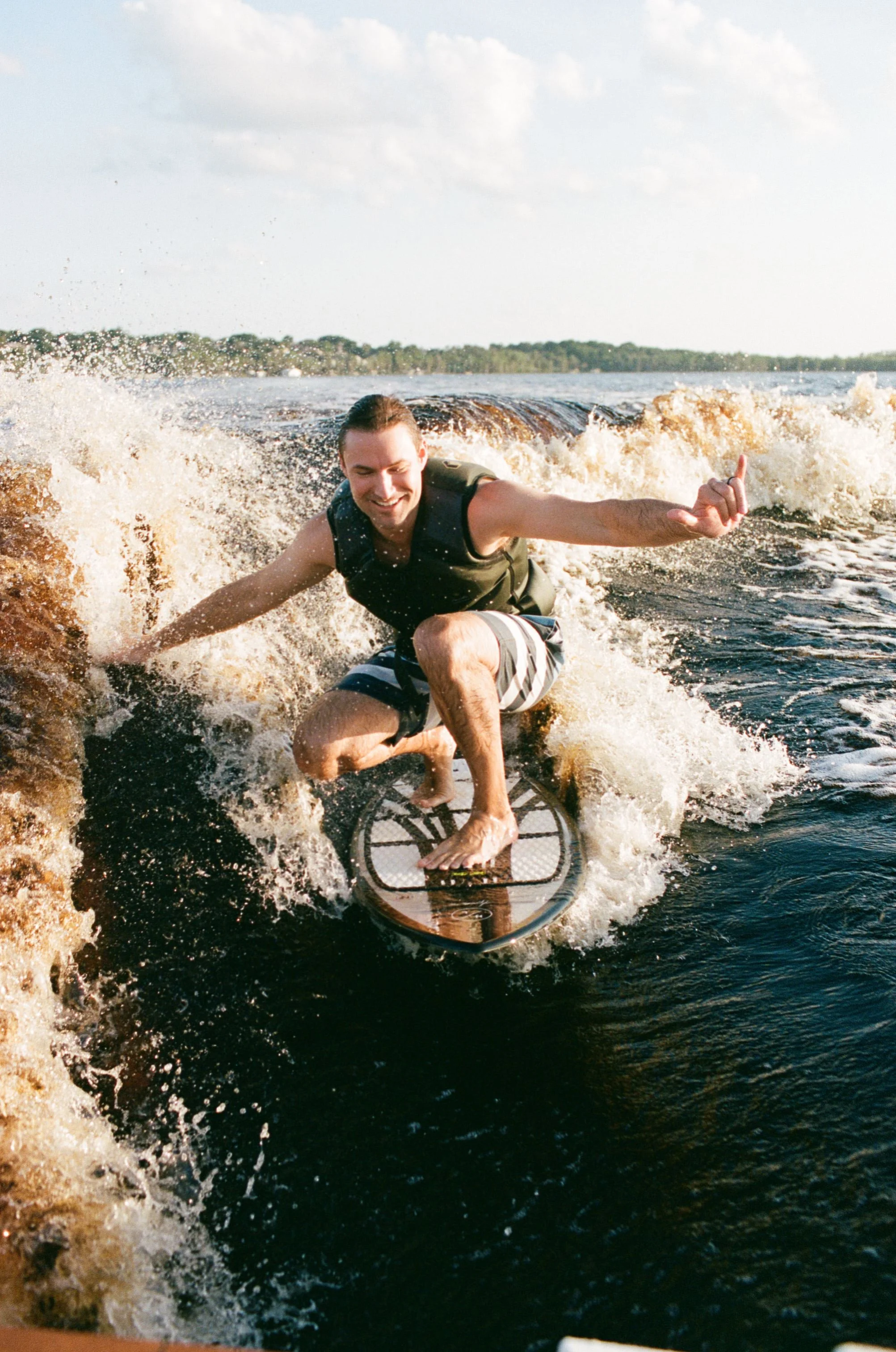 A young man happily surfing on a lake with water splashing around him and a distant tree-lined shoreline in the background.  Axis Wake Surf.